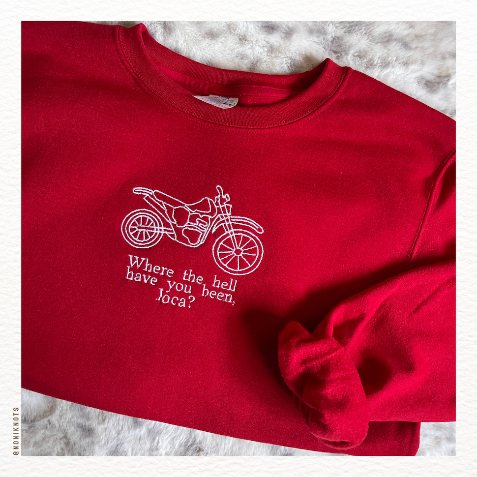 Sudadera con diseño de motocicleta y la frase de Jacob “Where the hell have you been loca?”
